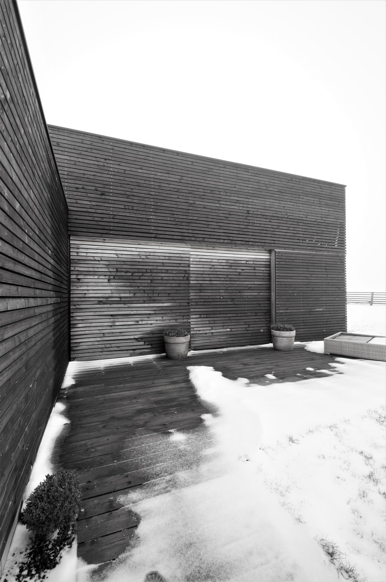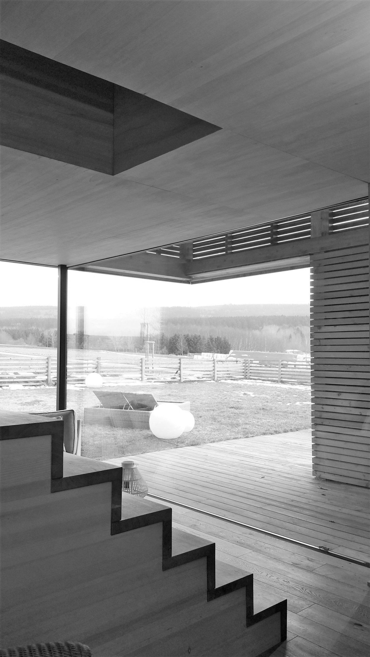 Aus diesen Gegensätzen leitet sich das Entwurfsmotiv ab. Durch wenige Handgriffe offenbart der vorher verschlossene und abweisende Baukörper sein überraschend geräumiges inneres Raumgefüge von Wohnhaus, Jagdzimmer und Patio. Großflächige Verglasungen öffnen den Innenraum zur Landschaft. Zwischen innerer und äußerer Hülle entsteht ein hybrider Raum, dessen Nutzung und Charakter sich mit der Stellung der Schiebewände ändert.