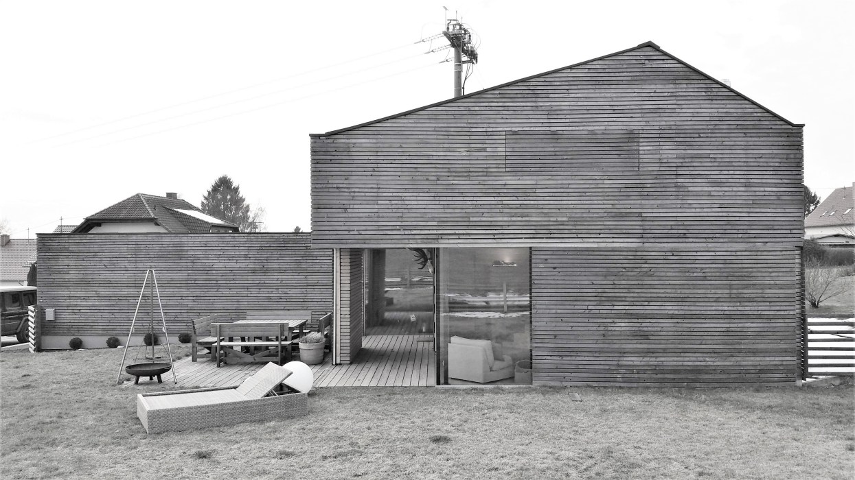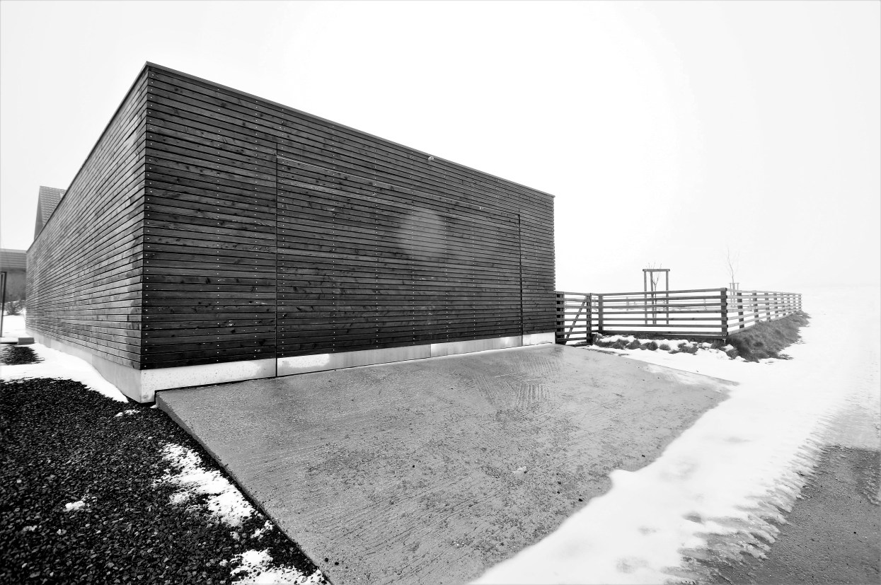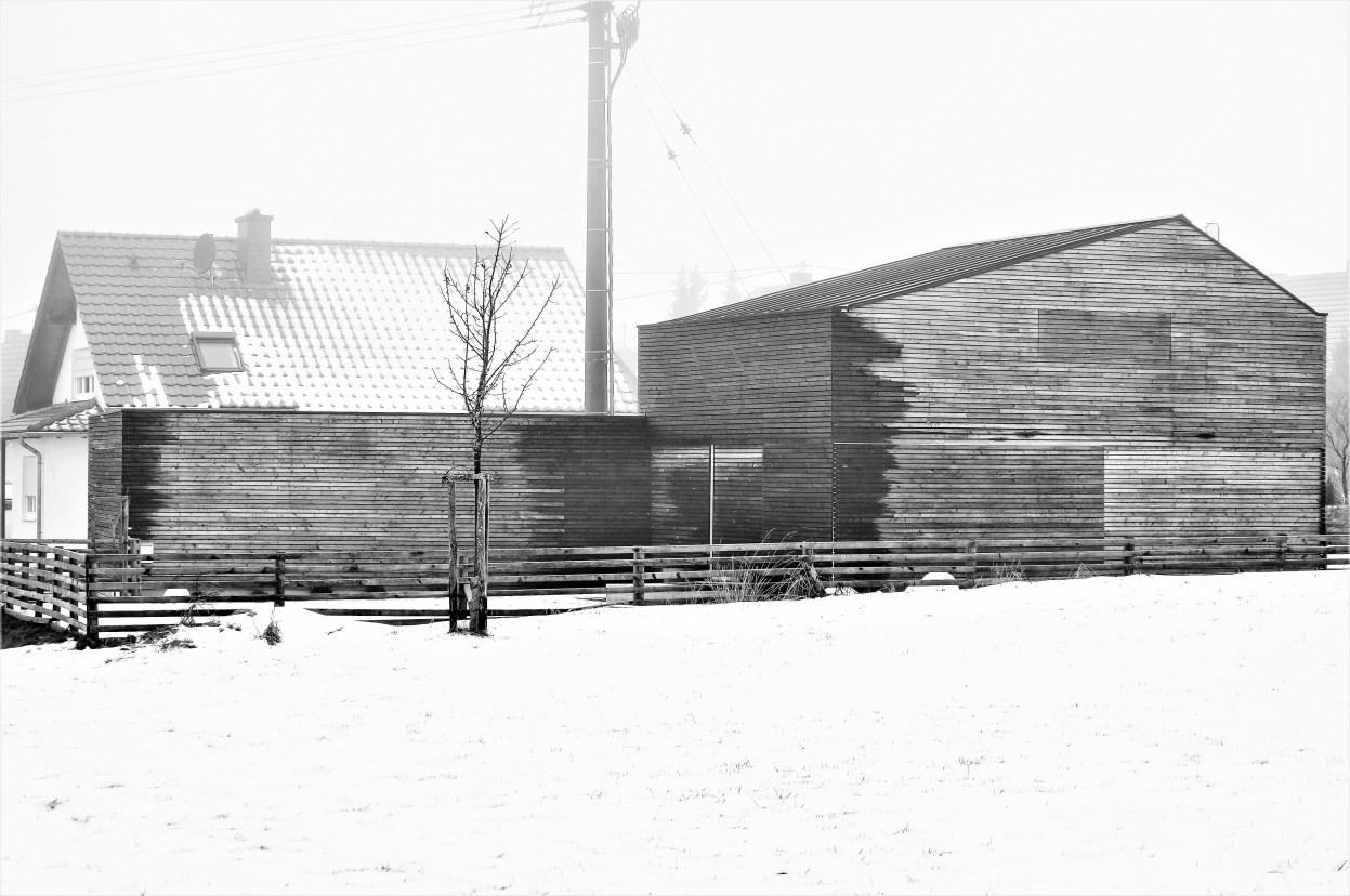 Das erratische Holzhaus im Übergang von Siedlung und Landschaft dient einer vierköpfigen Familie als Wochenend- und Feriendomizil. Der Hausherr nutzt es als Stützpunkt für die Jagd, das Versorgen der Jagdbeute und zum Bewirten von Gesellschaften im separierbaren Jagdzimmer. Eine Nutzbarkeit als zu einem späteren Zeitpunkt dauerhaft bewohntes Minimalhaus war gefordert.