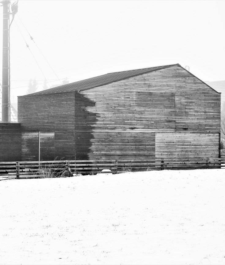 Das erratische Holzhaus im Übergang von Siedlung und Landschaft dient einer vierköpfigen Familie als Wochenend- und Feriendomizil. Der Hausherr nutzt es als Stützpunkt für die Jagd, das Versorgen der Jagdbeute und zum Bewirten von Gesellschaften im separierbaren Jagdzimmer. Eine Nutzbarkeit als zu einem späteren Zeitpunkt dauerhaft bewohntes Minimalhaus war gefordert.