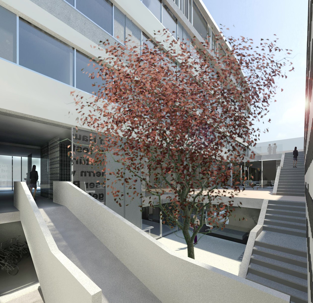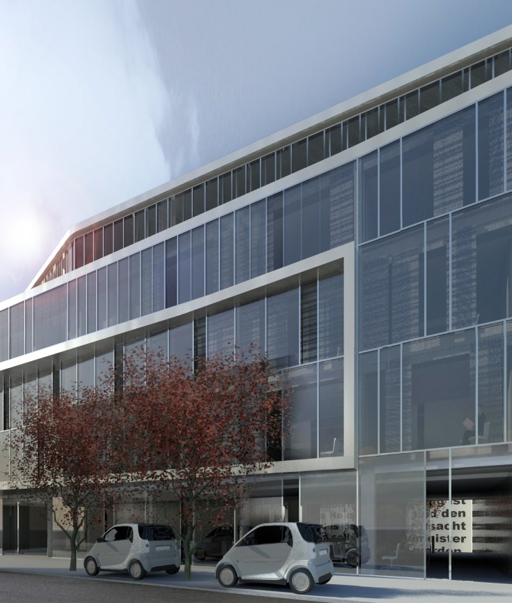 Der heutige Baukörper erscheint merkwürdig deplatziert und aufgebockt. Das Erdgeschoss verweigert jeden Kontakt mit dem Straßenraum. Die willkürlich gesetzte Lochfassade ist durch ins Leere laufende Lisenen vertikal „gegliedert“. Die neue Fassade öffnet sich erdgeschossig der Straße, sucht den selbstbewussten Dialog mit dem Kontext und baut Bezüge zu den Nachbargebäuden auf. Das dritte Obergeschoss schwenkt signifikant in den Straßenraum hinein. In spannungs-und respektvollem Kontrast vermittelt die gelagerte Glasfassade zwischen den Traufhöhen der Nachbarn. In gegenläufigem Schwung tritt das (optionale) Staffelgeschoss hinter die raumbestimmende Trauflinie zurück. Die Straßenfassade ist offen, transparent und einladend. Das Servicecenter im Erdgeschoss ist durch den Einsatz lichtdurchlässiger Trennwände durchscheinend bis zum Innenhof. Trotz der angestrebten Transparenz ist die Privatsphäre der Arbeitsplätze durch individuell bedienbare Flächenvorhänge gesichert. Die Nordausrichtung macht einen außenliegenden Sonnenschutz entbehrlich.