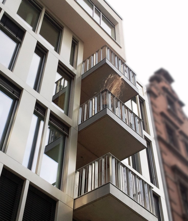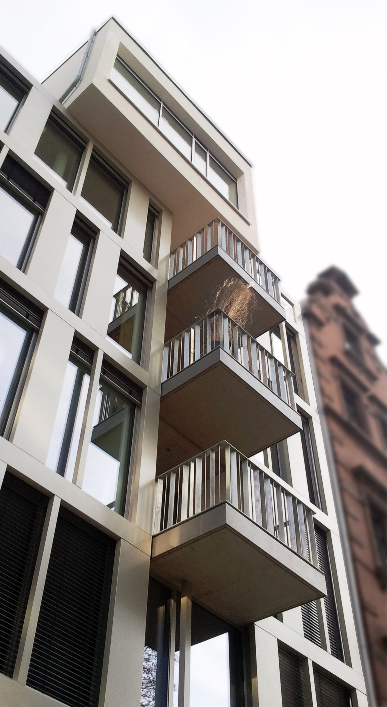 Die zeitgenössisch-abstrakte Fassade nimmt Bezüge der denkmalgeschützten Nachbarschaft auf (Sockel, Traufhöhen, ausgewogene Horizontalen und Vertikalen, großzügige Elementformate, plastische Gliederung) und sucht so bei aller Eigenständigkeit die Einbindung in das gewachsene Ensemble.