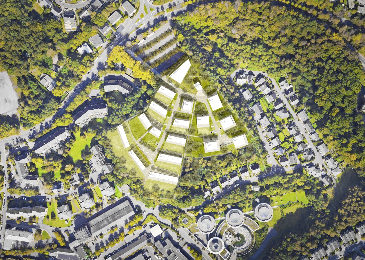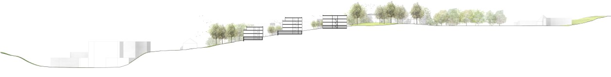 Wilder Aufwuchs von Robinien charakterisiert das Heidenköpfchen, vereinzelt ergänzt durch Eichen und immergrüne Gehölze, welche wohl noch aus der Zeit stammen, in der dieser Ort industriell genutzt wurde. Eine verwunschene Atmosphäre, die wir zu den Nachbarn hin erhalten, im Innern des zukünftigen Quartiers in weiterhin frei angeordneter Struktur zum Grundcharakter der neuen Lebensräume weiterentwickeln wollen. So verbleibt im Westen und Osten ein schmaler Bestandsstreifen als Filter zur Nachbarbebauung. Dahingegen sollte nach Süden ein breiterer Abschnitt, der Robinienhain al „kleine Wildnis“ verbleiben, der prinzipiell als Ruheraum, gelegentlich aber auch als Abenteuerspielplatz für die Kinder des Stadtteils zur Verfügung stehen kann.