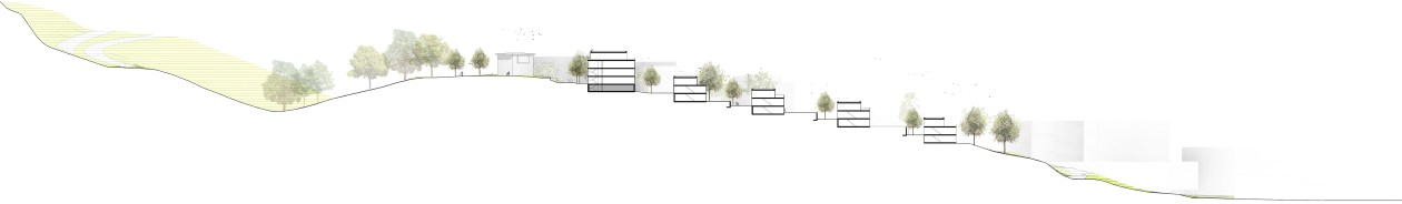Die grundsätzlich hangparallelen Baustrukturen ermöglichen Hauszugänge auf der Nordseite, auf einem neuen, höherliegenden und direkt an die Erdgeschosse angeschlossenen Niveau. Diese im hängigem Gelände angelegten, ebenen Freibereiche ermöglichen Gemeinschaft und ein Durchwohnen von innen nach außen. Gleichzeitig erweitern sie die direkt bewohnbaren Flächen des Quartiers und tragen in besonderer Weise zu einem belebten Quartier bei. Dahingegen befinden sich die Privatgärten immer an einem tieferliegenden Abschnitt im Süden der Gebäude, erlauben Rückzug und Intimität.