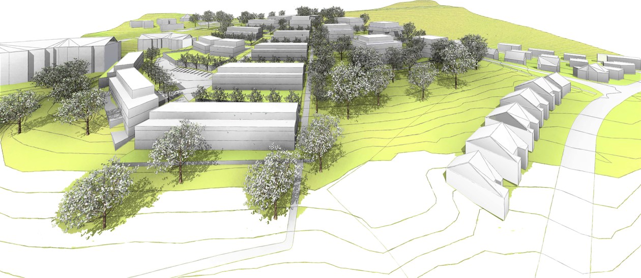 Der Verzicht auf die Erschließung privater Garagen ermöglicht hohe Aufenthalts- und Nutzungsqualität der öffentlichen und privaten Freiräume bei sparsamem Umgang mit Grund und Boden. Die hangparallele Zeilenstruktur ist für Baugruppen und individuelle Townhouses gleichermaßen geeignet und ermöglicht kostenbewusstes Bauen.