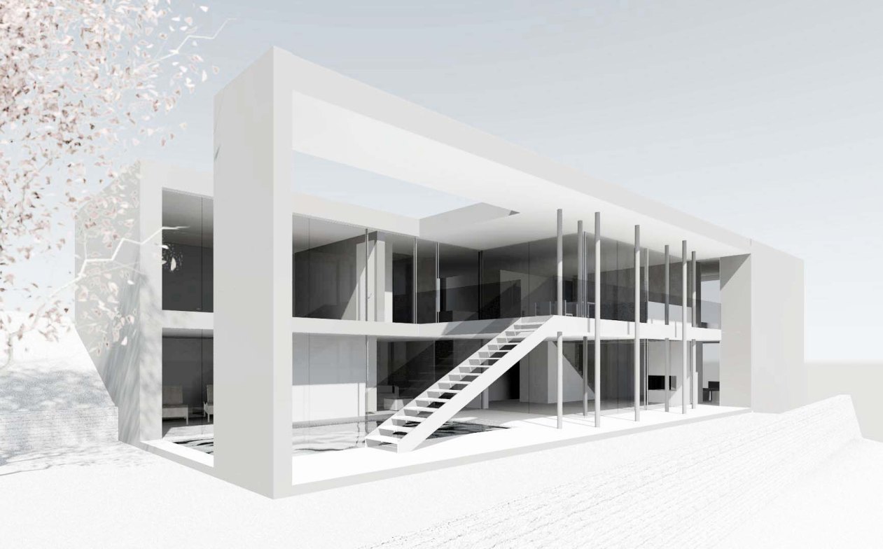 Der durch subtraktive Eingriffe geformte Baukörper bietet, neben dem Fernblick, im Nahbereich qualitätvolle, private Außenräume. Eine Anforderung der Bauherrschaft war ein im Gebäude erlebbares Wasserfeld.